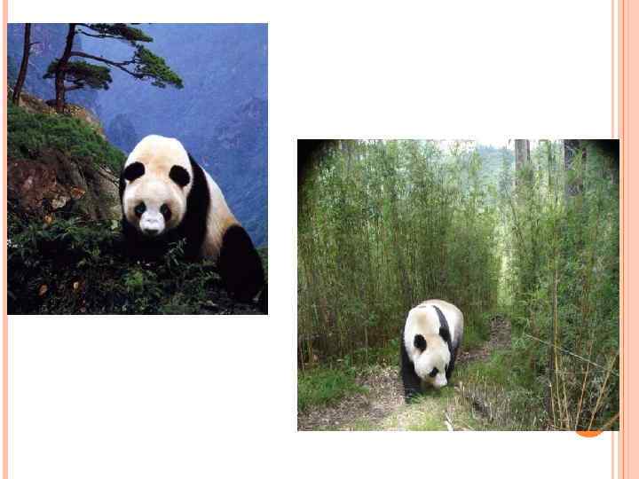 СРЕДА ОБИТАНИЯ Территория, обжитая пандами, небольшая. Они встречаются в горных районах китайских провинций Сычуань, Ганьсу и Тибет. Хотя раньше они также обитали в Индокитае и на о. Калимантан. В качестве дома большие панды выбирали себе густые бамбуковые леса. Живут они в горных районах, на высоте примерно от 1200 до 4500 метров над у. м. . С наступлением зимы они спускаются на высоту около 800 метров над у. м. , где климат в холодный период года является более благоприятным.