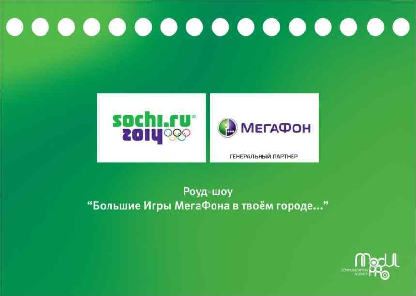 «Большие Игры Мега. Фона» Фестиваль инноваций и спорта «Большие Игры Мега. Фона» - проект, цель которого – популяризация Зимних Олимпийских Игр в Сочи и спорта в целом, среди молодежи и взрослого населения России. Проект проходит при поддержке Организационного комитета Олимпийских игр и Олимпийского комитета России. «Мега. Фон» , как генеральный партнер Зимних Олимпийских Игр 2014 года, в течение 3 х лет путешествий фестиваля по стране дает возможность жителям городов познакомиться с инновационными технологиями и почувствовать себя участником Олимпийского движения. На площадке мероприятия разворачивается парк с трассой биатлон, хоккейными площадками, выставкой гаджетов от «Мега. Фона» , настоящим 5 D кинотеатром, интересной шоу-программой и еще многими-многими активностями, которые абсолютно бесплатно доступны любому желающему. За период май-октябрь 2011 года роуд-шоу уже прошло 15 городов России, среди них столица Олимпийских игр 2014 года и столица Универсиады 2013 года - города Сочи и Казань. В торжественном открытии принимали участие: двукратный олимпийский чемпион по боксу Алексей Тищенко, трехкратная олимпийская чемпионка по синхронному плаванию и пресс-секретарь президента Олимпийского комитета России Мария Киселева, многократный чемпион мира по боксу Олег Маскаев, мэр Сочи Анатолий Пахомов, Ирина Слуцкая и многие другие. В 2012 году роуд-шоу посетит еще 14 городов из разных регионов страны!