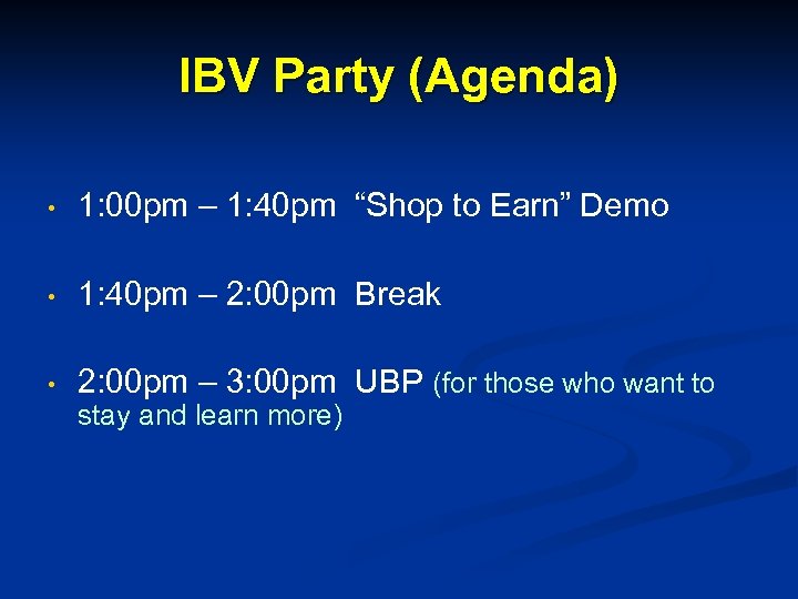 IBV Party (Agenda) • 1: 00 pm – 1: 40 pm “Shop to Earn” Demo • 1: 40 pm – 2: 00 pm Break • 2: 00 pm – 3: 00 pm UBP (for those who want to stay and learn more)