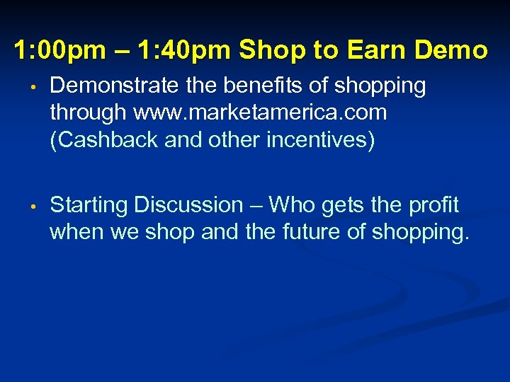 1: 00 pm – 1: 40 pm Shop to Earn Demo • Demonstrate the benefits of shopping through www. marketamerica. com (Cashback and other incentives) • Starting Discussion – Who gets the profit when we shop and the future of shopping.