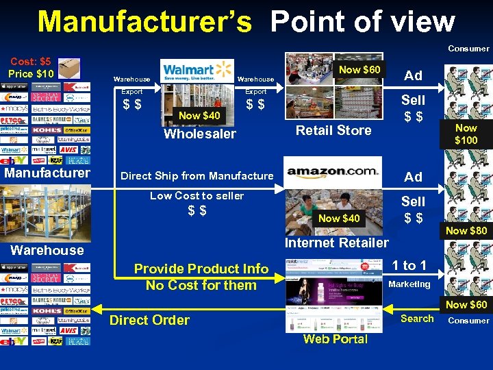 Manufacturer’s Point of view Consumer Cost: $5 Price $10 Now $60 Warehouse Export $$ $$ Now $40 Wholesaler Manufacturer Ad Warehouse Sell $$ Retail Store Direct Ship from Manufacture Ad Low Cost to seller Sell $$ Now $100 $$ Now $40 Internet Retailer Warehouse Now $80 1 to 1 Provide Product Info No Cost for them Marketing Now $60 Search Direct Order Web Portal Consumer