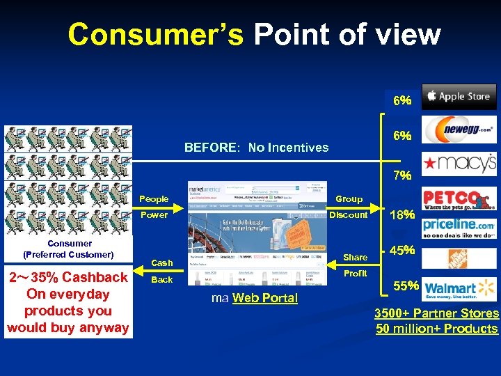 Consumer’s Point of view 6% 6% BEFORE: No Incentives 7% People Power Consumer (Preferred Customer) 2~ 35% Cashback On everyday products you would buy anyway Group Discount Share Cash 18% 45% Profit Back ma Web Portal 55% 3500+ Partner Stores 50 million+ Products