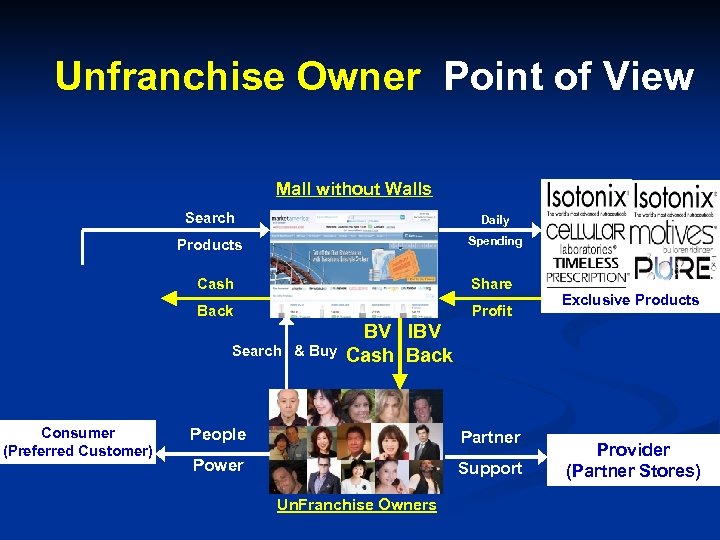 Unfranchise Owner Point of View Mall without Walls Search Daily Products Spending Cash Share Back Profit Search & Buy Consumer (Preferred Customer) Exclusive Products BV IBV Cash Back People Partner Power Support Un. Franchise Owners Provider (Partner Stores)