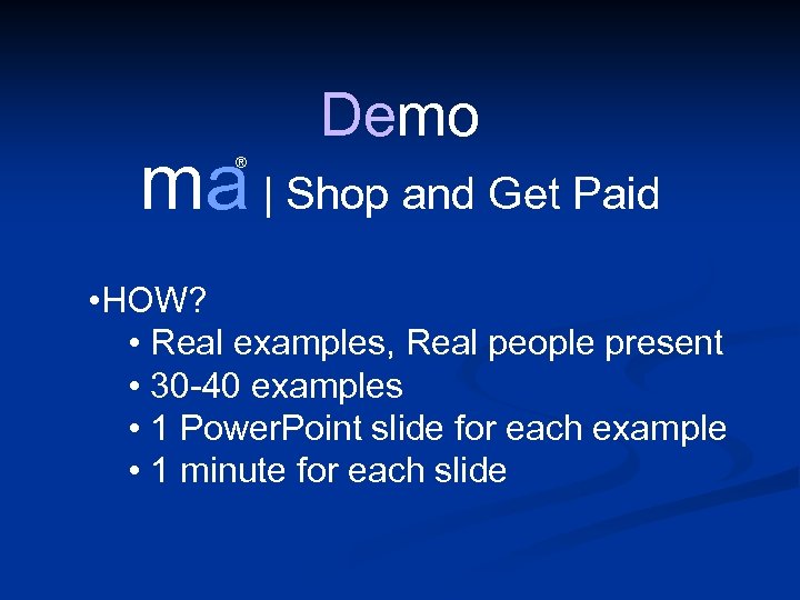 Demo ma | Shop and Get Paid ® • HOW? • Real examples, Real people present • 30 -40 examples • 1 Power. Point slide for each example • 1 minute for each slide