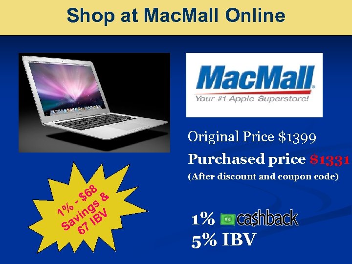 Shop at Mac. Mall Online Original Price $1399 Purchased price $1331 (After discount and coupon code) 68 & -$ s 1% ving BV Sa 67 I 1% 5% IBV