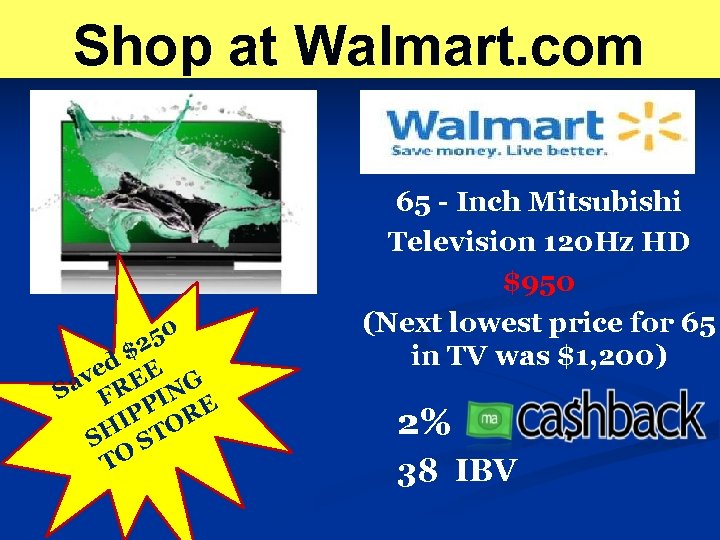 Shop at Walmart. com 50 $2 ed EE av R S F NG PI RE IP O SH ST TO 65 - Inch Mitsubishi Television 120 Hz HD $950 (Next lowest price for 65 in TV was $1, 200) 2% 38 IBV