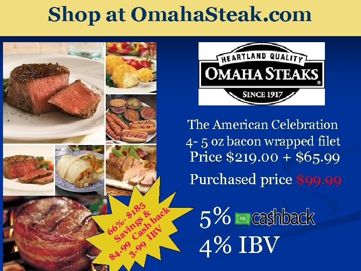 Shop at Omaha. Steak. com The American Celebration 4 - 5 oz bacon wrapped filet Price $219. 00 + $65. 99 Purchased price $99. 99 85 k $1 s & ac % ing h b 66 av as BV S C I 9 9. 9 3. 9 $4 5% 4% IBV