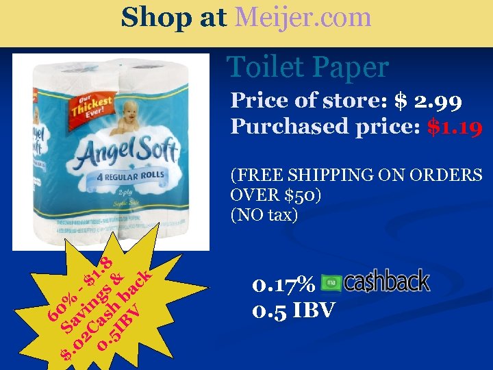 Shop at Meijer. com Toilet Paper Price of store: $ 2. 99 Purchased price: $1. 19 60 $. S % 02 av C ing $1 0. as s. 8 5 I h & B ba V c k (FREE SHIPPING ON ORDERS OVER $50) (NO tax) 0. 17% 0. 5 IBV