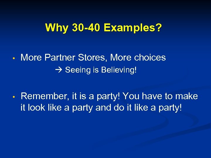 Why 30 -40 Examples? • More Partner Stores, More choices Seeing is Believing! • Remember, it is a party! You have to make it look like a party and do it like a party!