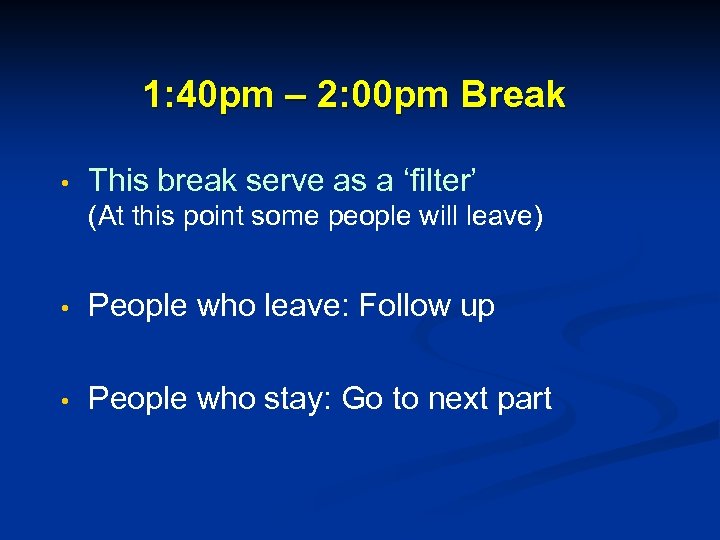 1: 40 pm – 2: 00 pm Break • This break serve as a ‘filter’ (At this point some people will leave) • People who leave: Follow up • People who stay: Go to next part