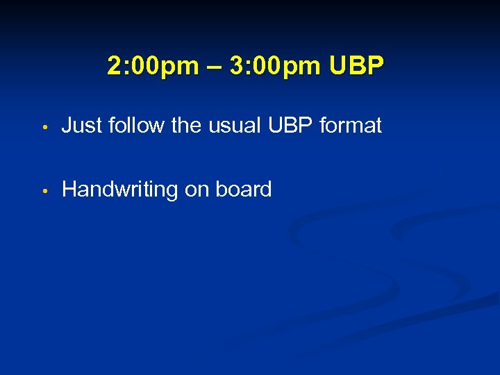 2: 00 pm – 3: 00 pm UBP • Just follow the usual UBP format • Handwriting on board