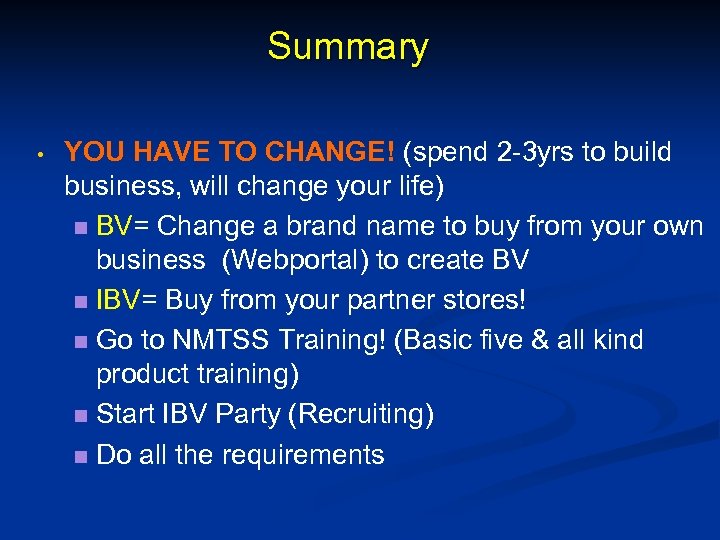 Summary • YOU HAVE TO CHANGE! (spend 2 -3 yrs to build business, will change your life) n BV= Change a brand name to buy from your own business (Webportal) to create BV n IBV= Buy from your partner stores! n Go to NMTSS Training! (Basic five & all kind product training) n Start IBV Party (Recruiting) n Do all the requirements