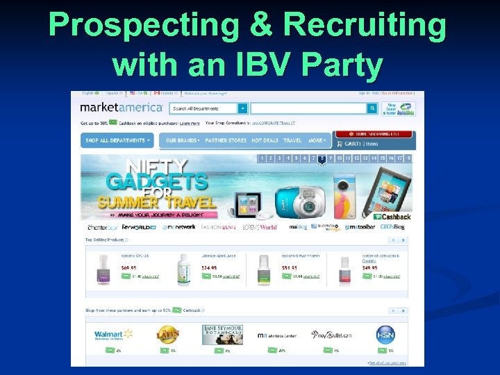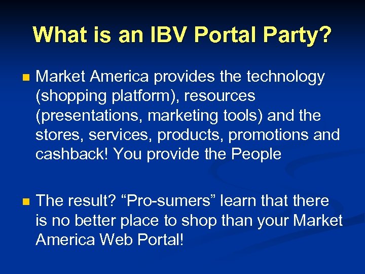 What is an IBV Portal Party? n Market America provides the technology (shopping platform), resources (presentations, marketing tools) and the stores, services, products, promotions and cashback! You provide the People n The result? “Pro-sumers” learn that there is no better place to shop than your Market America Web Portal!