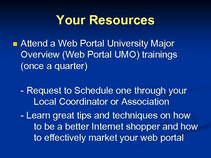 Your Resources n Attend a Web Portal University Major Overview (Web Portal UMO) trainings (once a quarter) - Request to Schedule one through your Local Coordinator or Association - Learn great tips and techniques on how to be a better Internet shopper and how to effectively market your web portal