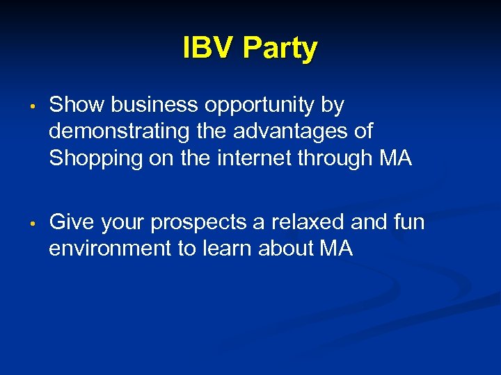 IBV Party • Show business opportunity by demonstrating the advantages of Shopping on the internet through MA • Give your prospects a relaxed and fun environment to learn about MA