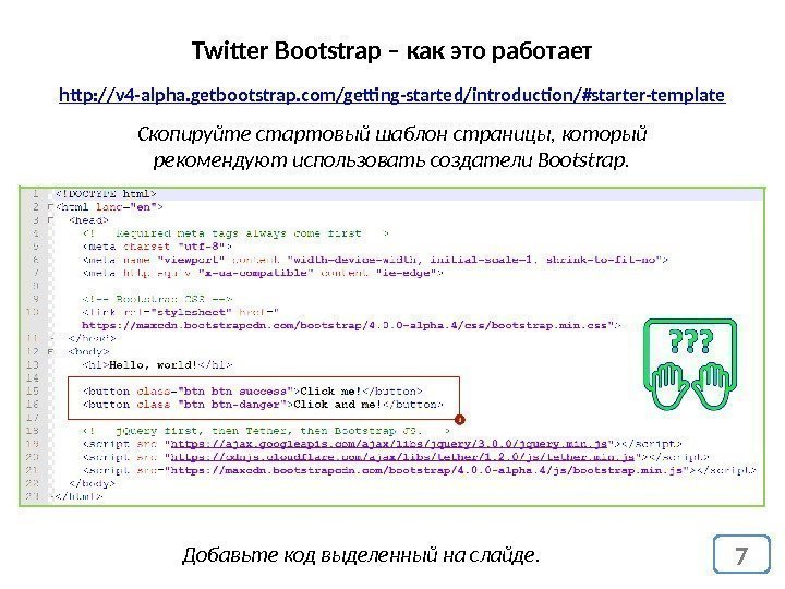7 Twitter Bootstrap – как это работает http: //v 4 -alpha. getbootstrap. com/getting-started/introduction/#starter-template Скопируйте стартовый шаблон страницы, который рекомендуют использовать создатели Bootstrap. Добавьте код выделенный на слайде.