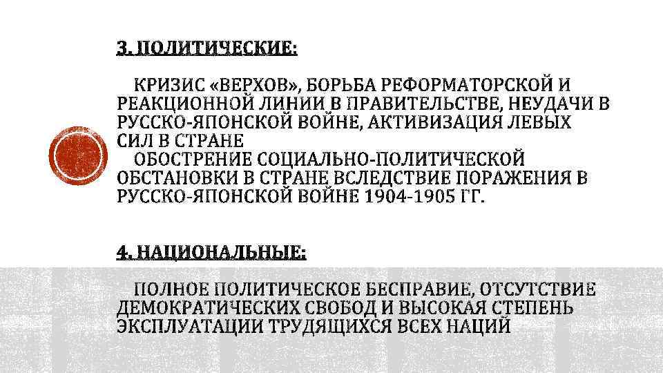 1. экономические: противоречие между начавшейся в стране капиталистической модернизацией и сохранением докапиталистических форм хозяйства (помещичье землевладение, община, малоземелье, аграрное перенаселение, кустарная промышленность); мировой экономический кризис начала XX в, , особо тяжело сказавшийся на экономике России 2. социальные: комплекс противоречий, сложившихся в обществе как вследствие развития капитализма, так и вследствие его незрелости