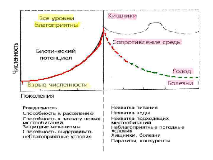 Равновесное состояние популяции: Все уровни благоприятны Биологический потенциал Взрыв численности Сопротивление среды: хищники, паразиты, голод, болезни , неблагоприятные погодные условия, конкуренция Снижение численности