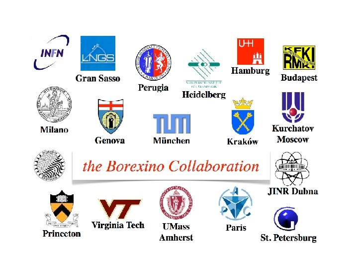 Перспективы • 7 Be • 8 B • Сезонные вариации (± 3. 5%) • Изучается возможность измерения (ограничения) потока CNO (зависит от подавления фона, связанного с космическими мюонами) • Возможно измерение потока pp-нейтрино с точностью около 15% на годовой статистике (наложение сигналов от 14 C ) • На большей статистике будет улучшено измерение потока геонейтрино и реактрных антинейтрино. достигнута 5% точность измерения, но желательная 3% точность (для калибровки при измерения потока “pp”, для улучшения точности солнечных моделей). Для этого требуется доочистка сцинтиллятора от 85 Kr и 210 Bi. Сейчас проводится отработка новых методик. – результат может быть улучшен в 2 раза при наборе большей статистики. Другая возможность – использование большего доверительного объема.