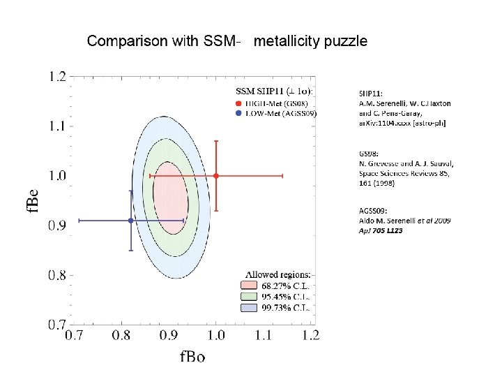 Анализ параметров нейтринных осцилляций по данным Борексино Используются также другие результаты Борексино: поток 7 Be и 8 B нейтрино (0. 217± 0. 038(stat)± 0. 008 (syst)) cpd/100 t, и спектральная форма 8 B (5 бин от 3 до 13 Мэ. В). Учтены как экспериментальные ошибки в измерении потоков (стат. и сист. в квадратуре), так и теоретические ошибки предсказания потоков солнечных нейтрино, включая корелляцию потоков 7 Be и 8 B нейтрино Исп. последние расчеты в модели High Z (A. Serenelli, W. Haxton, and C. Pe~na-Garay, ar. Xiv: 1104. 1639 v 1 [astro-ph]).