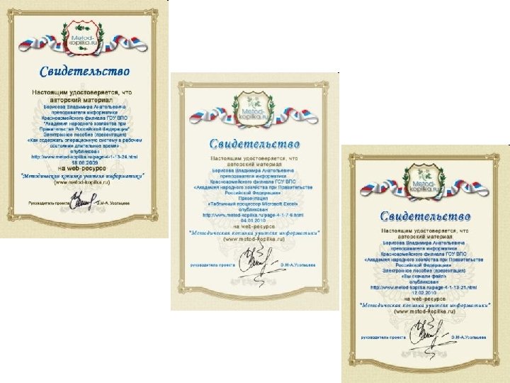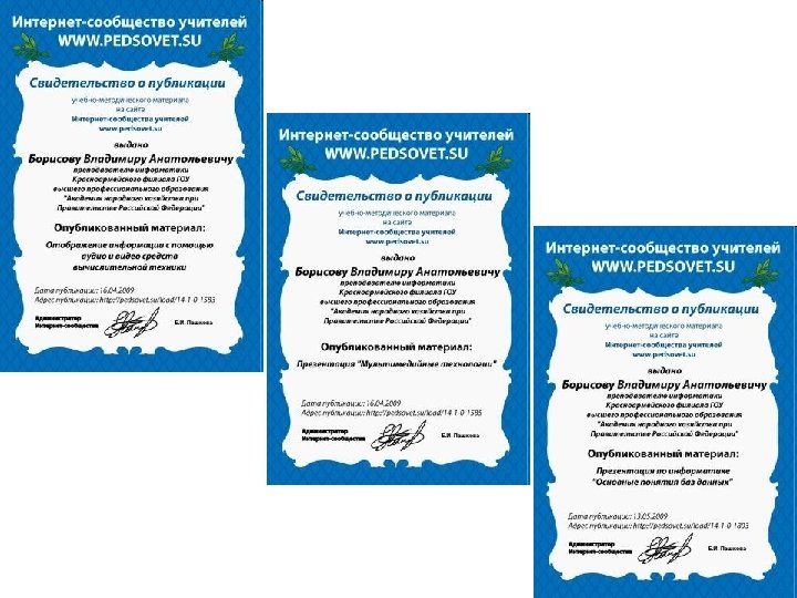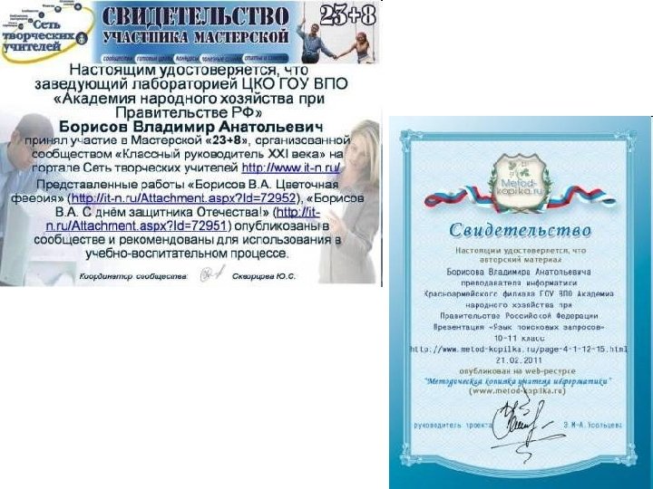 Образование: высшее. Специальность: учитель физики и информатики. ВУЗ: Саратовский государственный педагогический институт им. Федина. Факультет: физико - математический. Год окончания: 1994. Квалификационная категория: высшая. Награды: не имею. Личный сайт: http: //borisovva. ucoz. ru/