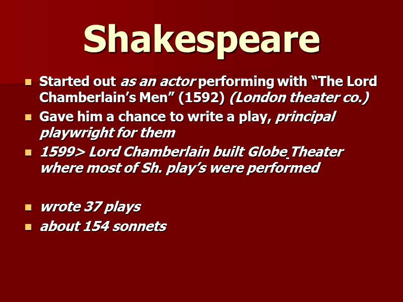 Shakespeare Started out as an actor performing with “The Lord Chamberlain’s Men” (1592) (London theater co.) Gave him a chance to write a play, principal playwright for them 1599> Lord Chamberlain built Globe Theater where most of Sh. play’s were performed wrote 37 plays about 154 sonnets