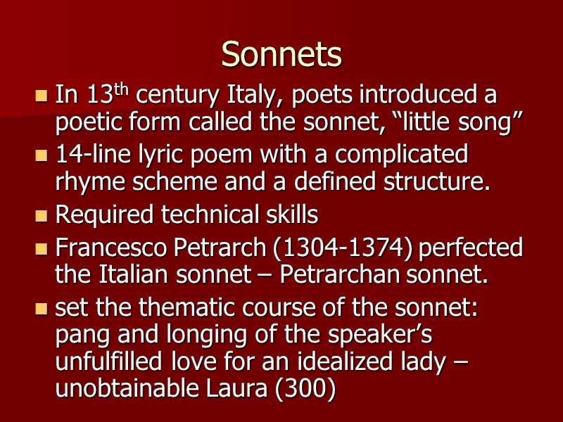 Sonnets In 13th century Italy, poets introduced a poetic form called the sonnet, “little song” 14-line lyric poem with a complicated rhyme scheme and a defined structure. Required technical skills Francesco Petrarch (1304-1374) perfected the Italian sonnet – Petrarchan sonnet. set the thematic course of the sonnet: pang and longing of the speaker’s unfulfilled love for an idealized lady – unobtainable Laura (300)