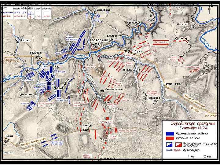 Бородинское сражение (во французской истории — битва у Москвы -реки) — крупнейшее сражение Отечественной войны 1812 года между русской армией под командованием генерала М. И. Кутузова и французской армией Наполеона I Бонапарта. Состоялось 26 августа (7 сентября) 1812 года у села Бородино.