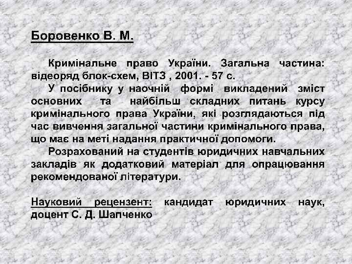 Боровенко В. М. Кримінальне право України ( Загальна частина ) Київ - 2001 р.