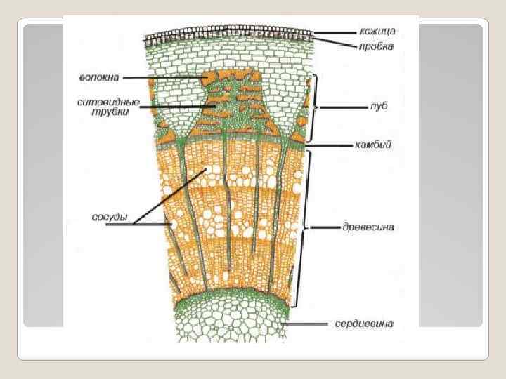 Флоэ ма (от греч. φλοῦς — кора) — то же, что и луб — проводящая ткань сосудистых растений, по которой происходит транспорт продуктов фотосинтеза к частям растения, где происходит их использование (подземные части, конусы нарастания) или накопление (зреющие семена, плоды) В стеблях большинства растений флоэма располагается снаружи по отношению к ксилеме, a листьях — обращена к нижней стороне жилок листовой пластинки, в проводящих пучках корней тяжи флоэмы и ксилемы чередуются 1. Ситовидные элементы (ситовидные клетки, ситовидные трубки и клетки-спутницы), обеспечивающие основной транспорт. Ситовидные клетки - основной проводящий элемент флоэмы у всех групп высших растений , исключая покрытосеменные 2. Склеренхимные элементы (склереиды и волокна), выполняющие опорную функцию 3. Паренхимные элементы (паренхимные клетки), обеспечивающие ближний радиальный транспорт