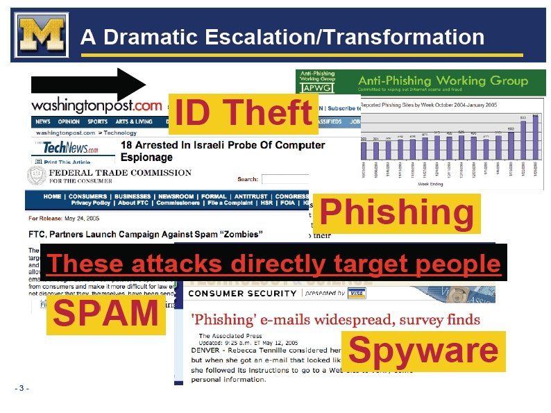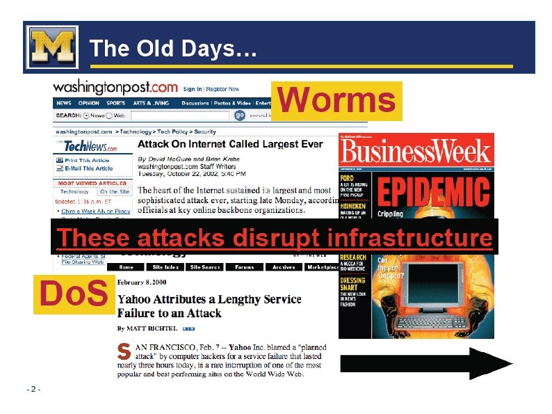 Host control ● ● ● Fortify system against other malicious attacks Disable anti-virus software Harvest sensitive information ● ● Pay. Pal, software keys, etc. Economic incentives for botnets Stresses need to patch/protect systems prior to attack Stronger protection boundaries required across applications in OSes