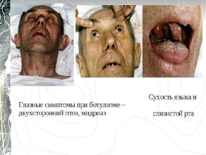 Клиникалық көріністері Инкубациялық кезеңі 6 -24 сағаттан 2 -6 тәулікке дейін созылуы мүмкін. Клиникалық белгілері: - Жалпы әлсіздік Ауыз қуысының кебуі бастың ауыруы Көз қарашығының ұлғаюы Диплопия Құсу, лоқсу Афония