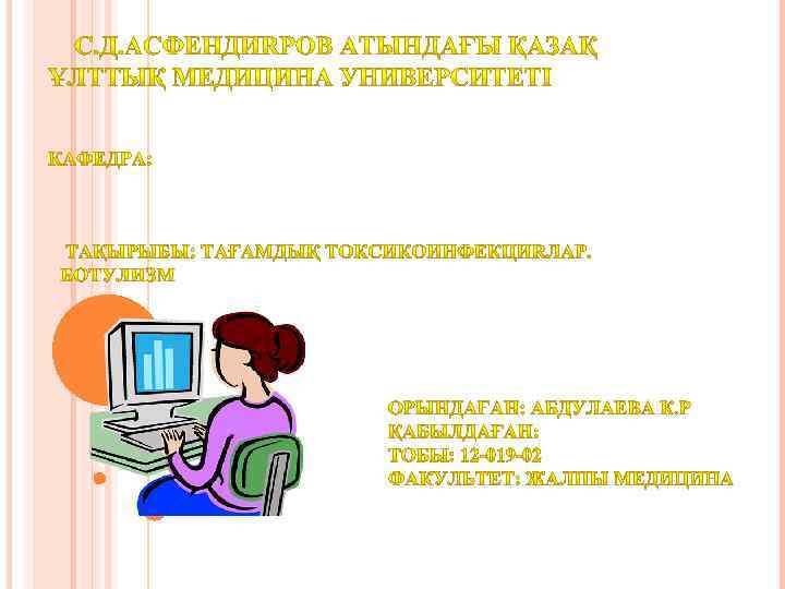 Ботулизм- тағамдық токсикоздың ауыр түріне жатады, көбіне адам өлімімен аяқталады. Өзінің аты «ботулизм» -деген латын тілінен алынған, «botulus» шұжық деген мағынаны береді, бұрындары бұл ауру тек шұжық жегендер арасында жиі кездескендіктен. Ауру қоздырғышы Cl. botulinum 1896 жылы Голландтық Ван – Эрменгем шошқа етінің қалдығынан, көкбауырынан және осы етті жегеннен кейін, ауырып өлген адамдардың ішегінен анықтаған.