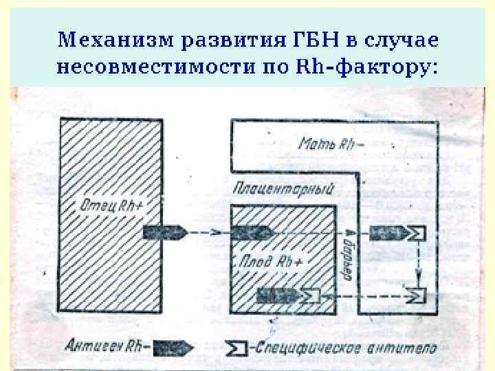 Механизм развития ГБН в случае несовместимости по Rh-фактору: • ГБН развивается, когда Rh(-) женщина беременна Rh(+) плодом (плод унаследовал Rh от отца, т. е. отец – Rh(+) • При прохождении Э плода, содержащих Rh через сосуды плаценты в организм матери, у нее начинают вырабатываться а/т, так как Rh является для матери а/г. • А/т в обратном направлении поступают в организм ребенка. • В э. ребенка происходит реакция «а/г + а/т» , результатом которой является гемолиз (гибель, разрушение) Э. Количество э в крови плода (ребенка) уменьшается, развивается анемия.