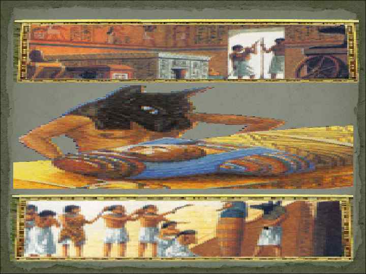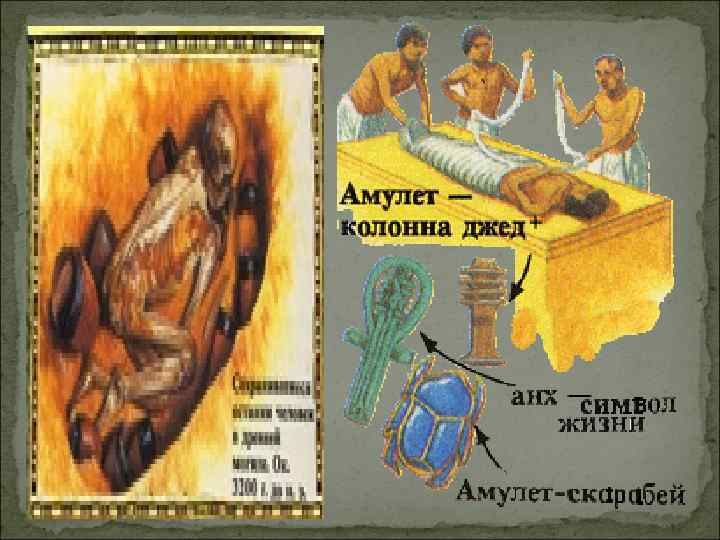Ритуал погребения Древние египтяне рассматривали смерть как переход к иной, лучшей жизни в Ином мире. Они верили, что сумеют реализовать все свои возможности только после смерти. Считалось, что у каждого человека есть три души - ка, ба и ах. Чтобы все они существовали вечно, считалось необходимым сохранять тела умерших. Древние египтяне испробовали различные методы для сохранения тел. В Верхнем Египте в додинастическую эпоху тела хоронили в неглубоких ямах. Они быстро высыхали в горячем песке и по большей части сохранялись от разложения.