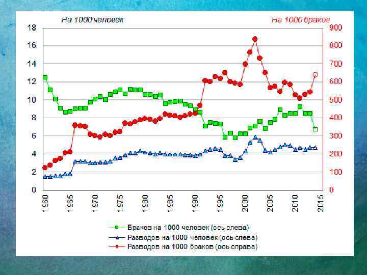 Количество разводов в РФ На 1000 человек населения 1) Годы Единиц 1950 49378 0, 5 1960 184398 1, 5 1970 396589 3, 0 1980 580720 4, 2 1990 559918 3, 8 1995 665904 4, 5 2000 627703 4, 3 2003 798824 5, 5 2004 635835 4, 4 2005 604942 4, 2 2008 703412 4, 9 2009 699430 4, 9 2010 639321 4, 5 2011 669376 4, 7 2012 644101 4, 5 2013 667971 4, 7 20142) 693730 4, 7