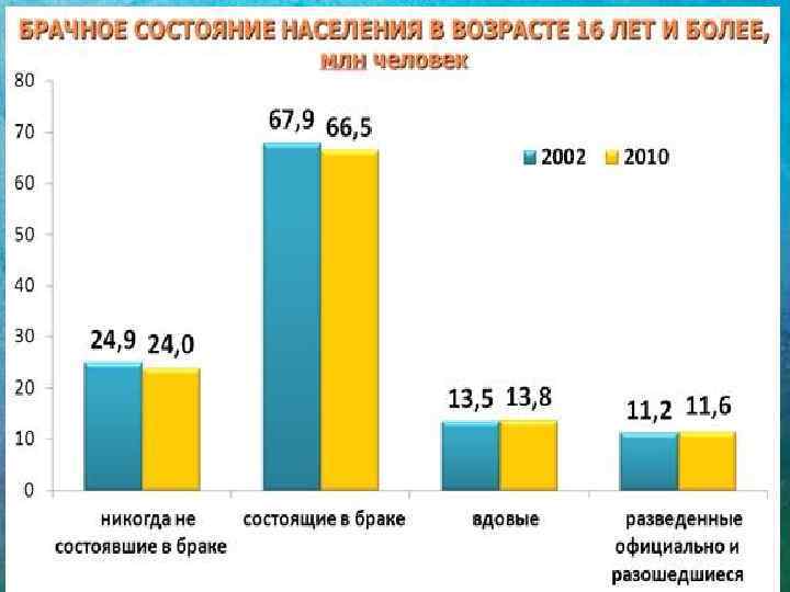 Регионы с самыми высокими Общим коэффициентом брачности Регионы с самыми низкими Общим коэффициентом брачности Российская Федерация – 8, 4 г. Санкт-Петербург 11, 2 Республика Ингушетия 4, 8 Г. Севастополь 11, 1 Республика Северная Осетия - Алания 6, 1 Ханты-Мансийский авт. округ. Югра 10, 0 Чеченская республика 6, 1 Тюменская область 9, 7 Карачаево-Черкесская республика 6, 2 Сахалинская область 9, 6 Ленинградская область 6, 2 Ямало-Ненецкий авт. округ 9, 6 Республика Тыва 6, 3 Камчатский край 9, 5 Республика Калмыкия 6, 6 Калининградская область 9, 5 Кабардино-Балкарская Республика 6, 4 Хабаровский край 9, 4 Республика Мордовия 6, 8 Приморский край 9, 3 Республика Дагестан 6, 8