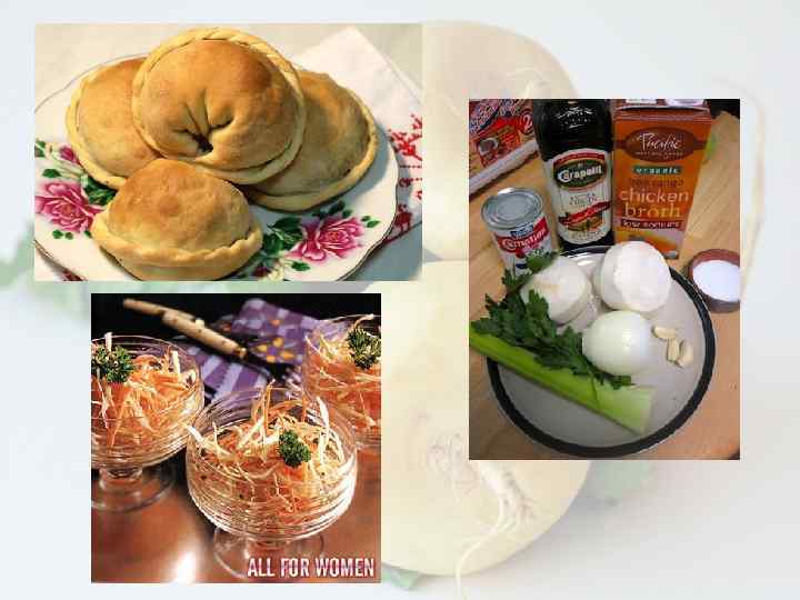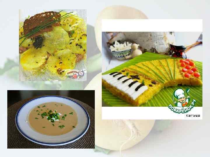 А ЕЩЁ… Репу можно засушить, как фрукты, нарезав её, как чипсы – тонкими ломтиками, и использовать всю зиму – все витамины и минералы прекрасно в ней сохранятся. Можно засолить репу, или замариновать – вместе с яблоками, свеклой, луком и другими овощами или фруктами. Молодые листья репы очень нежные и вкусные – их тоже добавляют в соленья, а также готовят с ними зелёные супы и салаты. Из репы можно сварить вкусное и полезное варенье, помогающее в лечении сердечнососудистых заболеваний, или приготовить цукаты, которые будут не хуже фруктовых, и даже полезнее их. Сегодня, к сожалению, большинство людей привыкли к рафинированной пище, и уговорить есть репу довольно трудно не только детей, выросших на магазинных «вкусняшках» , но и взрослых, прекрасно понимающих её ценность для здоровья. Однако так бывает до тех пор, пока репу не попробуешь – после этого есть блюда из неё захочется снова и снова – надо только уметь её готовить. «Салат из тыквы с медом» Ингредиенты: • • Тыква, 300 г. Репа, 1 шт. Яболки, 2 шт. Мёд, 1 – 2 ст. л. Описание приготовления: Сырую тыкву нарезать мелкими кубиками, смешать с медом и оставить на 35 -40 мин. Яблоки без сердцевины, репу или брюкву нарезать мелкими кубиками, соединить с тыквой, хорошо перемешать.
