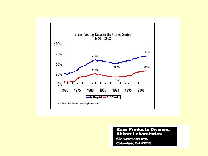 The resurgence of breastfeeding at the end of the second millennium (Wright and Schanler, J Nutr. 131, 2001) • Between 1971 and 1995 increase was for all groups. • Between 1984 and 1995 increase was in groups less likely to breastfeed (low income, low education, African American, WIC) • Early resurgence of breastfeeding concurrent to “natural childbirth” and women’s movement in white well educated families