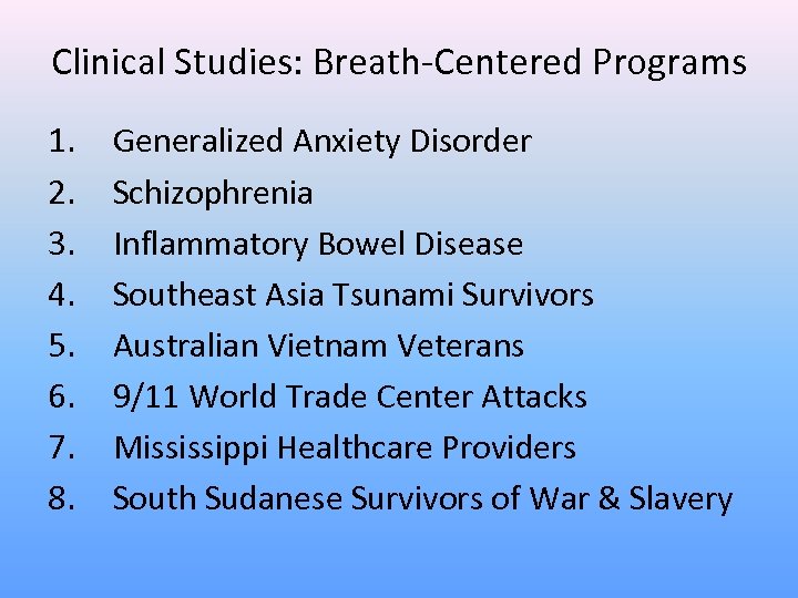 Clinical Studies: Breath-Centered Programs 1. 2. 3. 4. 5. 6. 7. 8. Generalized Anxiety Disorder Schizophrenia Inflammatory Bowel Disease Southeast Asia Tsunami Survivors Australian Vietnam Veterans 9/11 World Trade Center Attacks Mississippi Healthcare Providers South Sudanese Survivors of War & Slavery