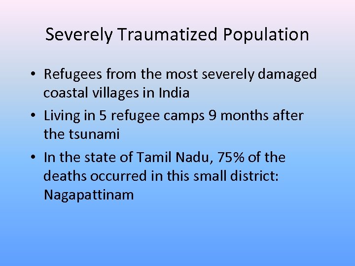Severely Traumatized Population • Refugees from the most severely damaged coastal villages in India • Living in 5 refugee camps 9 months after the tsunami • In the state of Tamil Nadu, 75% of the deaths occurred in this small district: Nagapattinam