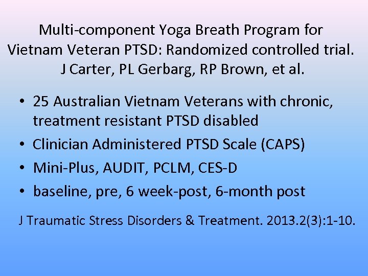 Multi-component Yoga Breath Program for Vietnam Veteran PTSD: Randomized controlled trial. J Carter, PL Gerbarg, RP Brown, et al. • 25 Australian Vietnam Veterans with chronic, treatment resistant PTSD disabled • Clinician Administered PTSD Scale (CAPS) • Mini-Plus, AUDIT, PCLM, CES-D • baseline, pre, 6 week-post, 6 -month post J Traumatic Stress Disorders & Treatment. 2013. 2(3): 1 -10.
