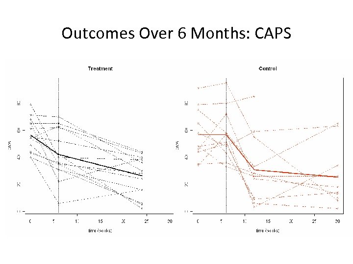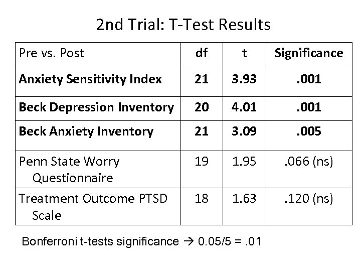 2 nd Trial: T-Test Results Pre vs. Post df t Significance Anxiety Sensitivity Index 21 3. 93 . 001 Beck Depression Inventory 20 4. 01 . 001 Beck Anxiety Inventory 21 3. 09 . 005 Penn State Worry Questionnaire Treatment Outcome PTSD Scale 19 1. 95 . 066 (ns) 18 1. 63 . 120 (ns) Bonferroni t-tests significance 0. 05/5 =. 01