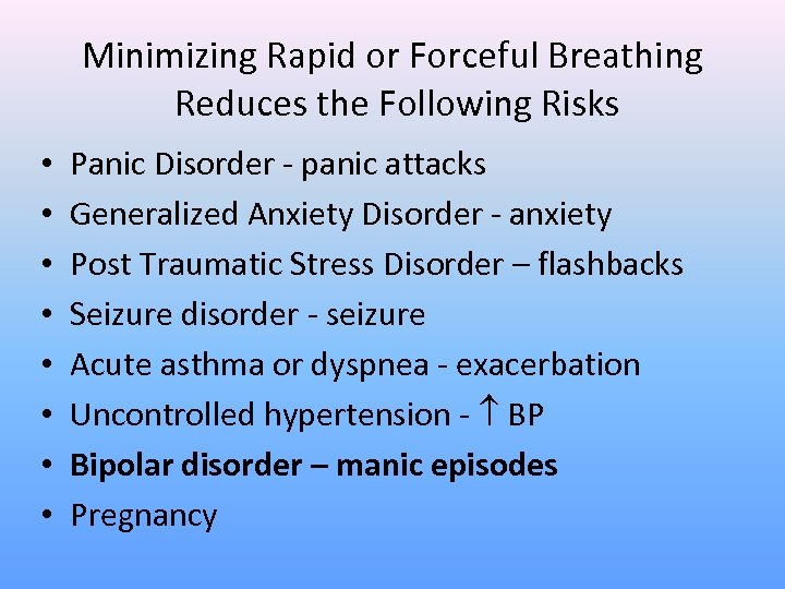 Minimizing Rapid or Forceful Breathing Reduces the Following Risks • • Panic Disorder - panic attacks Generalized Anxiety Disorder - anxiety Post Traumatic Stress Disorder – flashbacks Seizure disorder - seizure Acute asthma or dyspnea - exacerbation Uncontrolled hypertension - BP Bipolar disorder – manic episodes Pregnancy