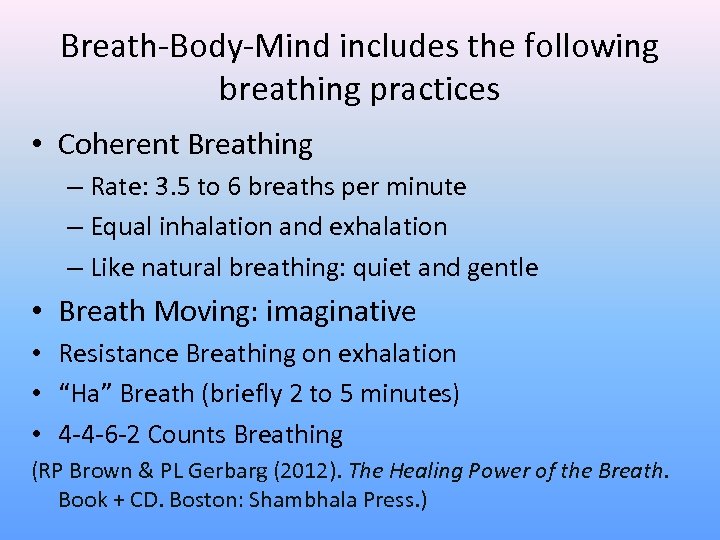 Breath-Body-Mind includes the following breathing practices • Coherent Breathing – Rate: 3. 5 to 6 breaths per minute – Equal inhalation and exhalation – Like natural breathing: quiet and gentle • Breath Moving: imaginative • Resistance Breathing on exhalation • “Ha” Breath (briefly 2 to 5 minutes) • 4 -4 -6 -2 Counts Breathing (RP Brown & PL Gerbarg (2012). The Healing Power of the Breath. Book + CD. Boston: Shambhala Press. )