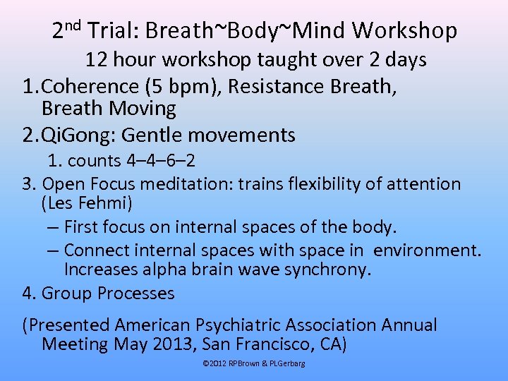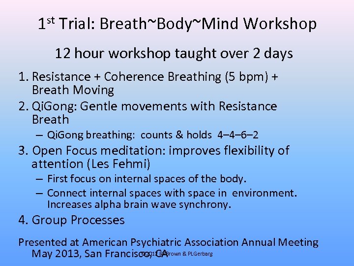1 st Trial: Breath~Body~Mind Workshop 12 hour workshop taught over 2 days 1. Resistance + Coherence Breathing (5 bpm) + Breath Moving 2. Qi. Gong: Gentle movements with Resistance Breath – Qi. Gong breathing: counts & holds 4– 4– 6– 2 3. Open Focus meditation: improves flexibility of attention (Les Fehmi) – First focus on internal spaces of the body. – Connect internal spaces with space in environment. Increases alpha brain wave synchrony. 4. Group Processes Presented at American Psychiatric Association Annual Meeting © 2012 RPBrown & PLGerbarg May 2013, San Francisco, CA