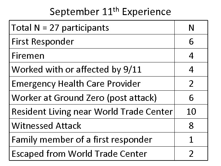 September 11 th Experience Total N = 27 participants First Responder Firemen Worked with or affected by 9/11 Emergency Health Care Provider Worker at Ground Zero (post attack) Resident Living near World Trade Center Witnessed Attack Family member of a first responder Escaped from World Trade Center N 6 4 4 2 6 10 8 1 2
