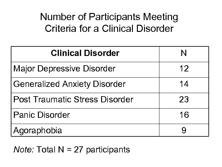 Number of Participants Meeting Criteria for a Clinical Disorder N Major Depressive Disorder 12 Generalized Anxiety Disorder 14 Post Traumatic Stress Disorder 23 Panic Disorder 16 Agoraphobia 9 Note: Total N = 27 participants
