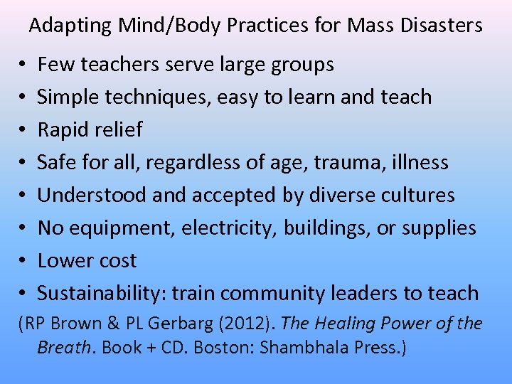 Adapting Mind/Body Practices for Mass Disasters • • Few teachers serve large groups Simple techniques, easy to learn and teach Rapid relief Safe for all, regardless of age, trauma, illness Understood and accepted by diverse cultures No equipment, electricity, buildings, or supplies Lower cost Sustainability: train community leaders to teach (RP Brown & PL Gerbarg (2012). The Healing Power of the Breath. Book + CD. Boston: Shambhala Press. )
