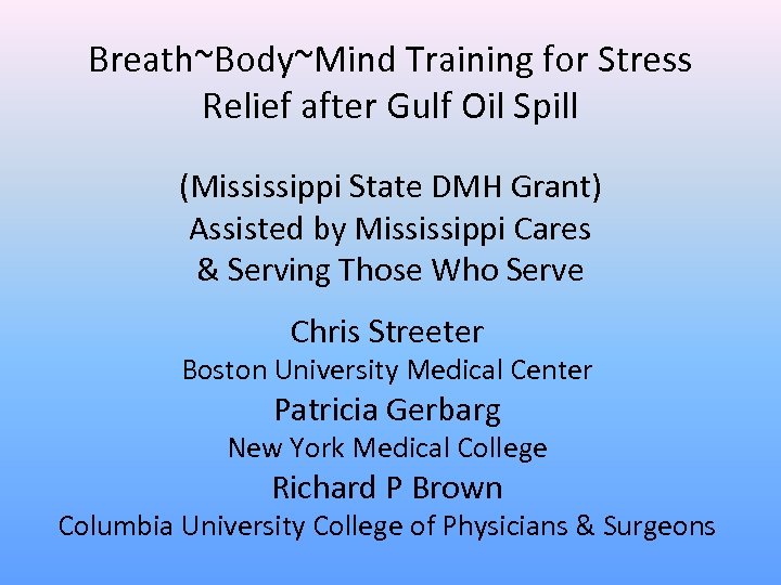 Breath~Body~Mind Training for Stress Relief after Gulf Oil Spill (Mississippi State DMH Grant) Assisted by Mississippi Cares & Serving Those Who Serve Chris Streeter Boston University Medical Center Patricia Gerbarg New York Medical College Richard P Brown Columbia University College of Physicians & Surgeons